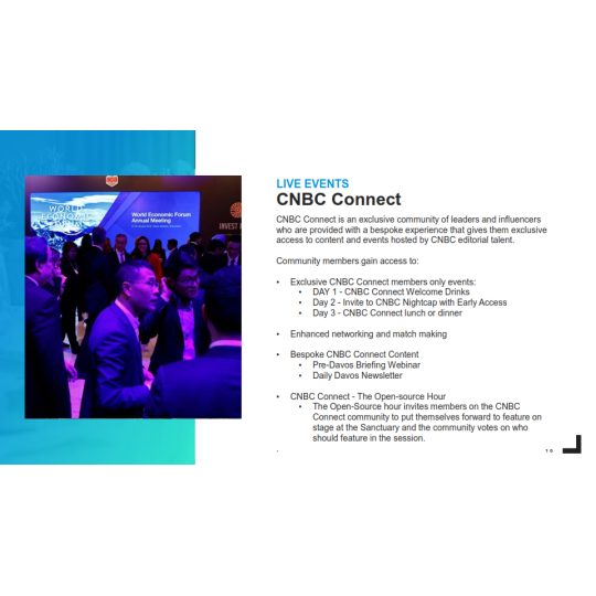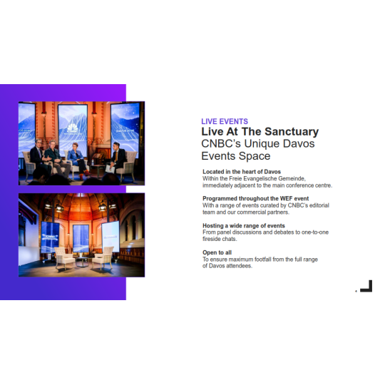 Các nhà lãnh đạo chính trị và kinh doanh trên thế giới sẽ gặp nhau để thảo luận, và trong một số trường hợp, đặt ra chương trình nghị sự toàn cầu cho năm tới. NBCU thuộc đài CNBC đưa tin về sự kiện này về cách các nhà lãnh đạo thế giới đang hợp tác để giải quyết các vấn đề mà thế giới phải đối mặt vào năm 2023 đi kèm với chương trình dành riêng cho sự kiện trong suốt cả tuần.