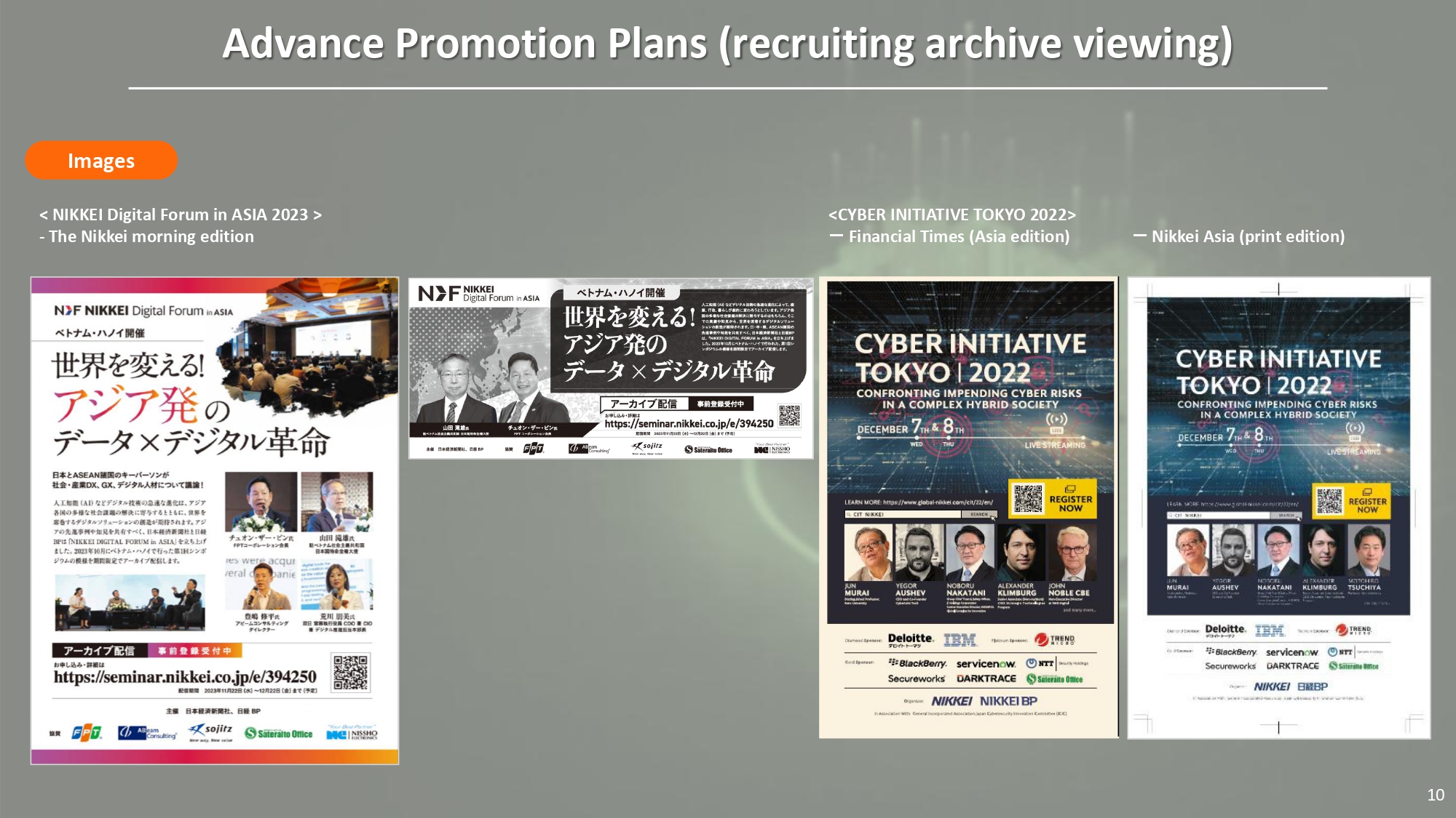 Ngay từ giai đoạn công bố sự kiện, thương hiệu của các nhà tài trợ sẽ xuất hiện trên các kênh truyền thông của Nikkei Inc. và Nikkei Business Publications, bao gồm Nikkei Asia, ấn bản Nikkei buổi sáng, các nền tảng báo chí chuyên ngành của Nikkei BP, cùng website chính thức của chương trình. Mức độ hiển thị được phân tầng rõ ràng theo các gói tài trợ, từ vị trí nổi bật nhất cho các đối tác Diamond và Platinum, đến sự hiện diện phù hợp cho các gói Gold, Silver và Bronze.