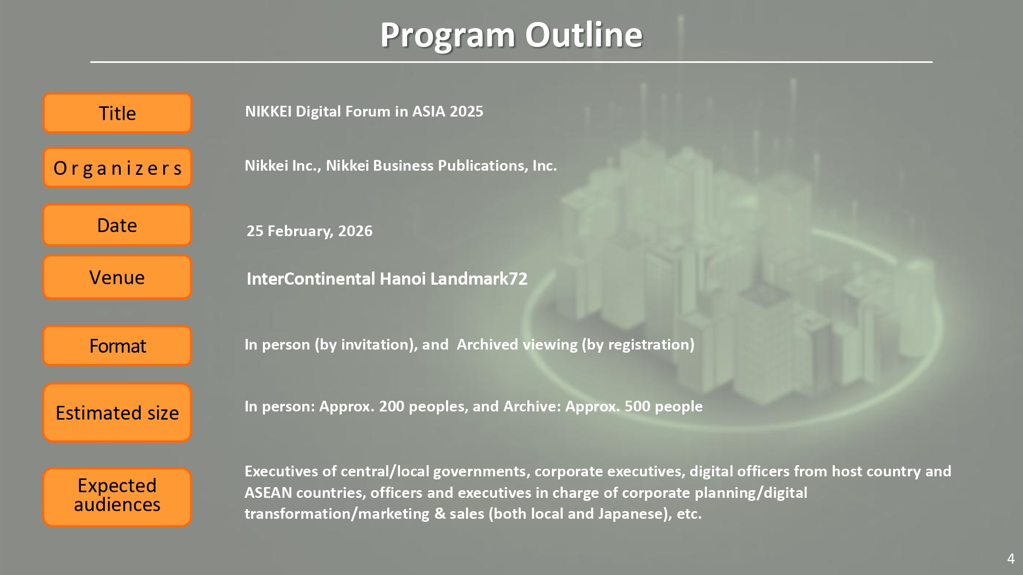 NIKKEI Digital Forum in ASIA 2025 phù hợp với các doanh nghiệp công nghệ, tài chính, tư vấn, hạ tầng số, sản xuất và logistics, cũng như các tập đoàn đang tìm kiếm cơ hội nâng cao hình ảnh thương hiệu trong bối cảnh chuyển đổi số và phát triển bền vững của khu vực. Việc đồng hành tài trợ cho phép doanh nghiệp lựa chọn mức độ hiện diện tương xứng với chiến lược truyền thông và định vị dài hạn của mình.