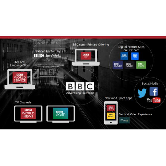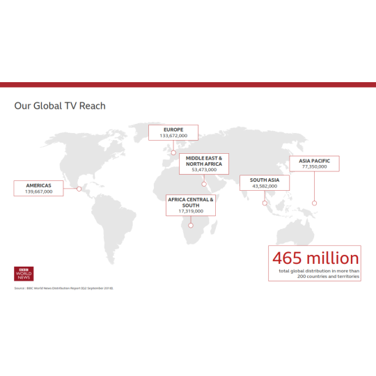 BBC (British Broadcasting Corporation - Tập đoàn Truyền hình Anh quốc) là kênh truyền thông nổi tiếng, và có sức lan toản rộng lớn nhất hiện nay, có mặt tại hơn 200 quốc gia, hơn 465 triệu hộ gia đình xem kênh, có mặt trên 178 tàu du lịch, 53 hãng hàng không, 3 triệu phòng khách sạn, 13 kênh trực tiếp và 23 mạng điện thoại di động.