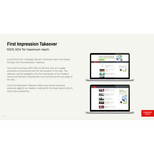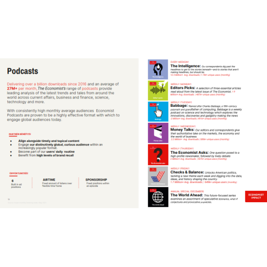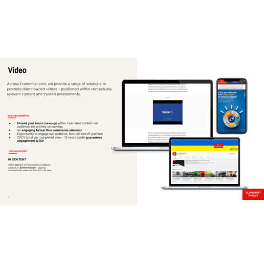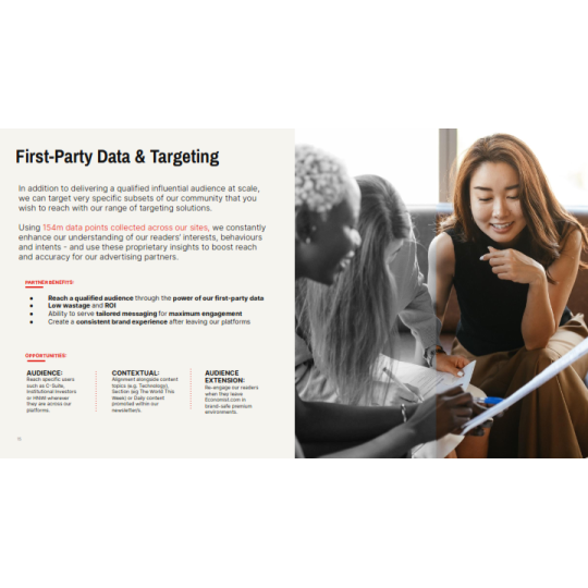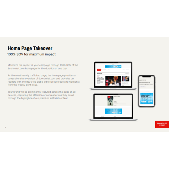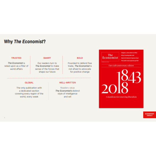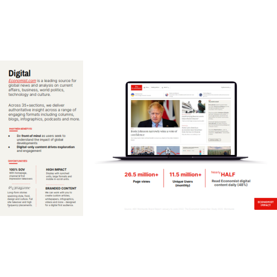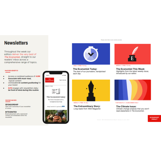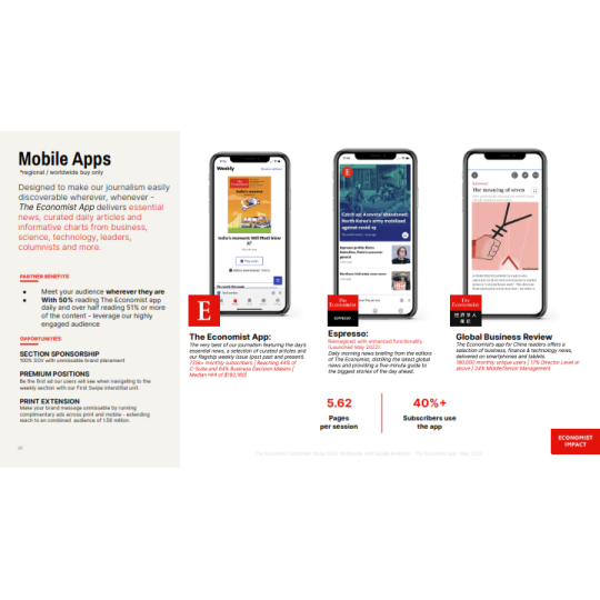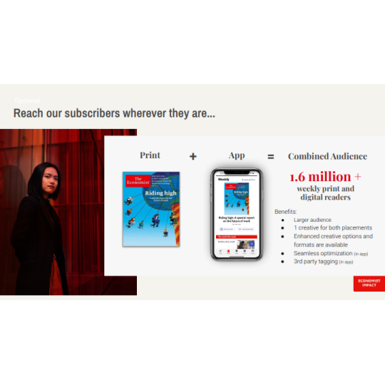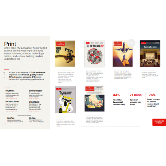 The Economist là báo tài chính toàn cầu, nổi tiếng với lịch sử hơn 179 năm, các bài viết hoặc hoạt động quảng cáo trên báo sẽ tiếp cận được với lượng lớn độc giả là các Doanh nhân, Nhà đầu tư nổi tiếng đọc The Economist hàng ngày như Bill Gates, Lary Ellison, Eric Schimidt,...