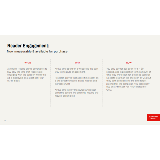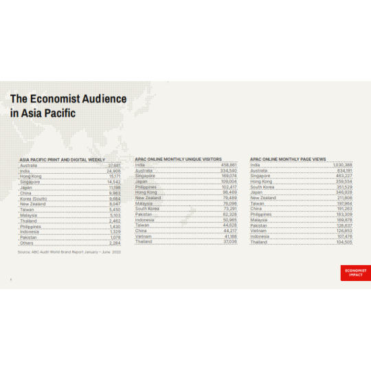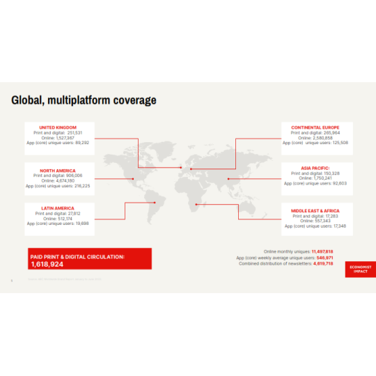 Lượng độc giả online website trung thành: 9,697,355/ tháng (là Lượng độc giả phải trả phí 369USD/năm để đọc tin tức trên Economist nên đây là lượng độc giả trung thành và chất lượng cao).