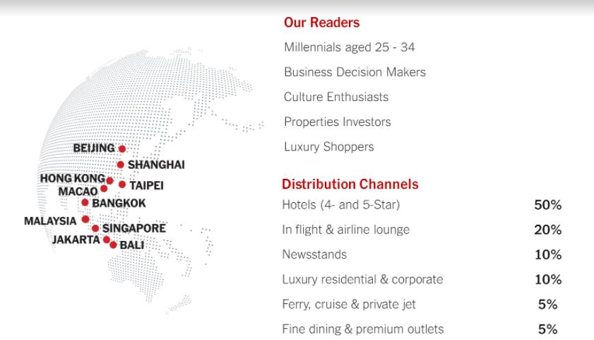 Tạp chí được phân phối ở các khách sạn 4 - 5 sao, trong khoang hành khách máy bay và sảnh sân bay, khu dân cư cao cấp, du thuyền, chuyên cơ riêng, các nhà hàng sang trọng và các chương trình triển lãm quốc tế...tại hầu hết các thành phố lớn của Trung Quốc như Beijing (Bắc Kinh), Shanghai (Thượng Hải),Taipei (Đài Bắc), Macao, HongKong, BangKok (Thái Lan), Malaysia, Singapore, Jakarta (Indonesia), Bali (Indonesia).